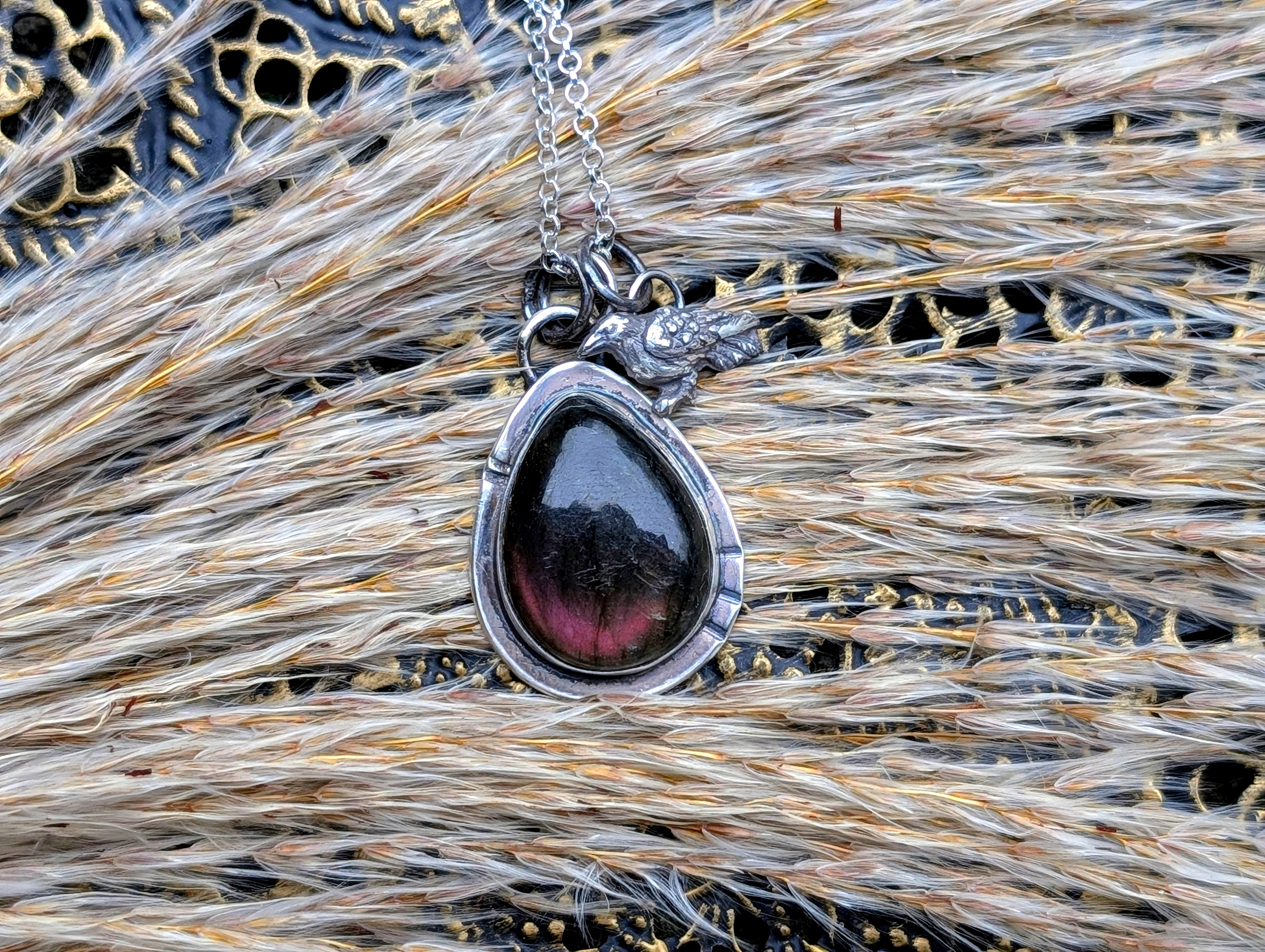 925er Sterlingsilber, natürlicher, roter Labradorit. Der Rabe ist von mir handgemacht.