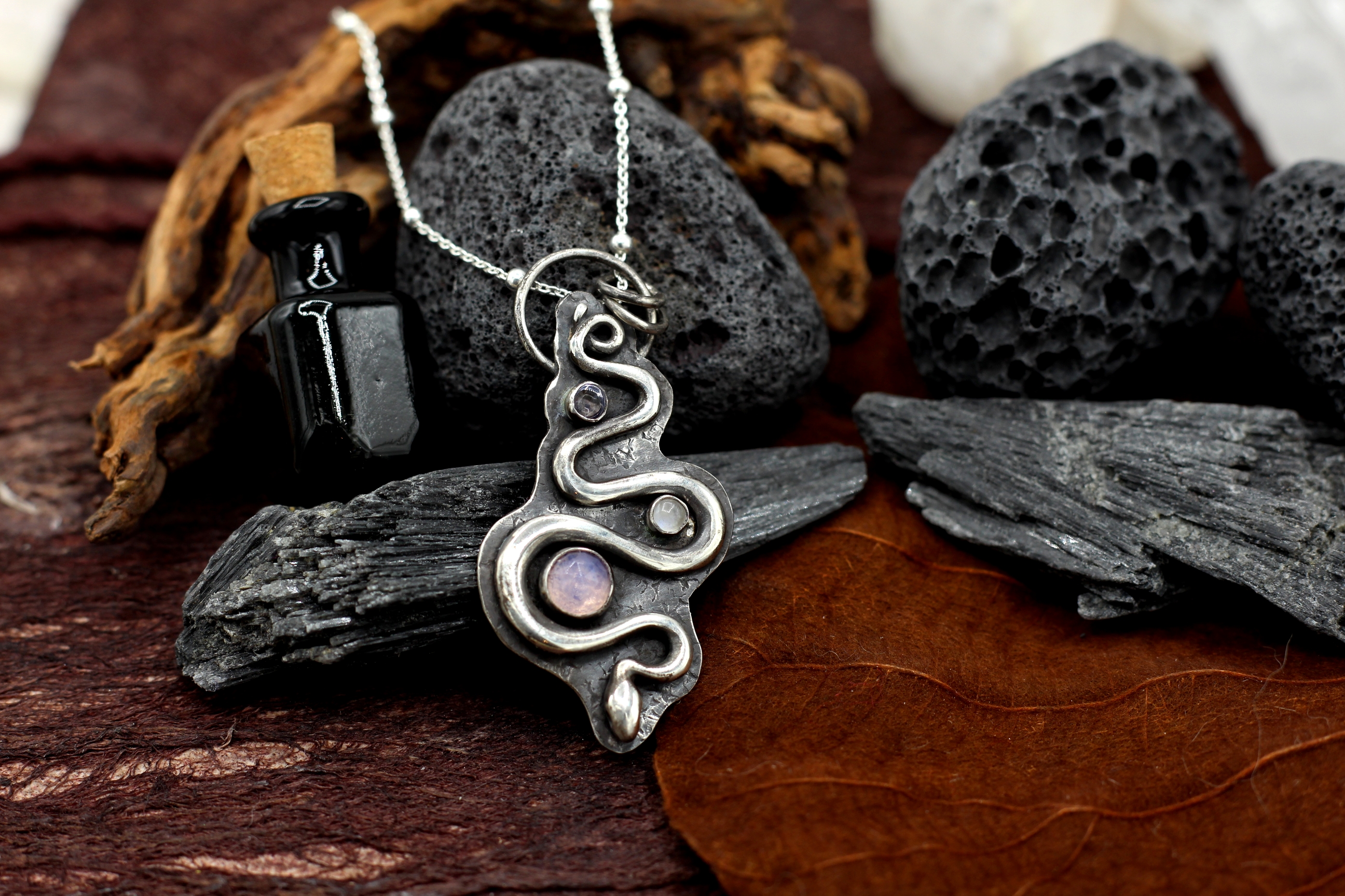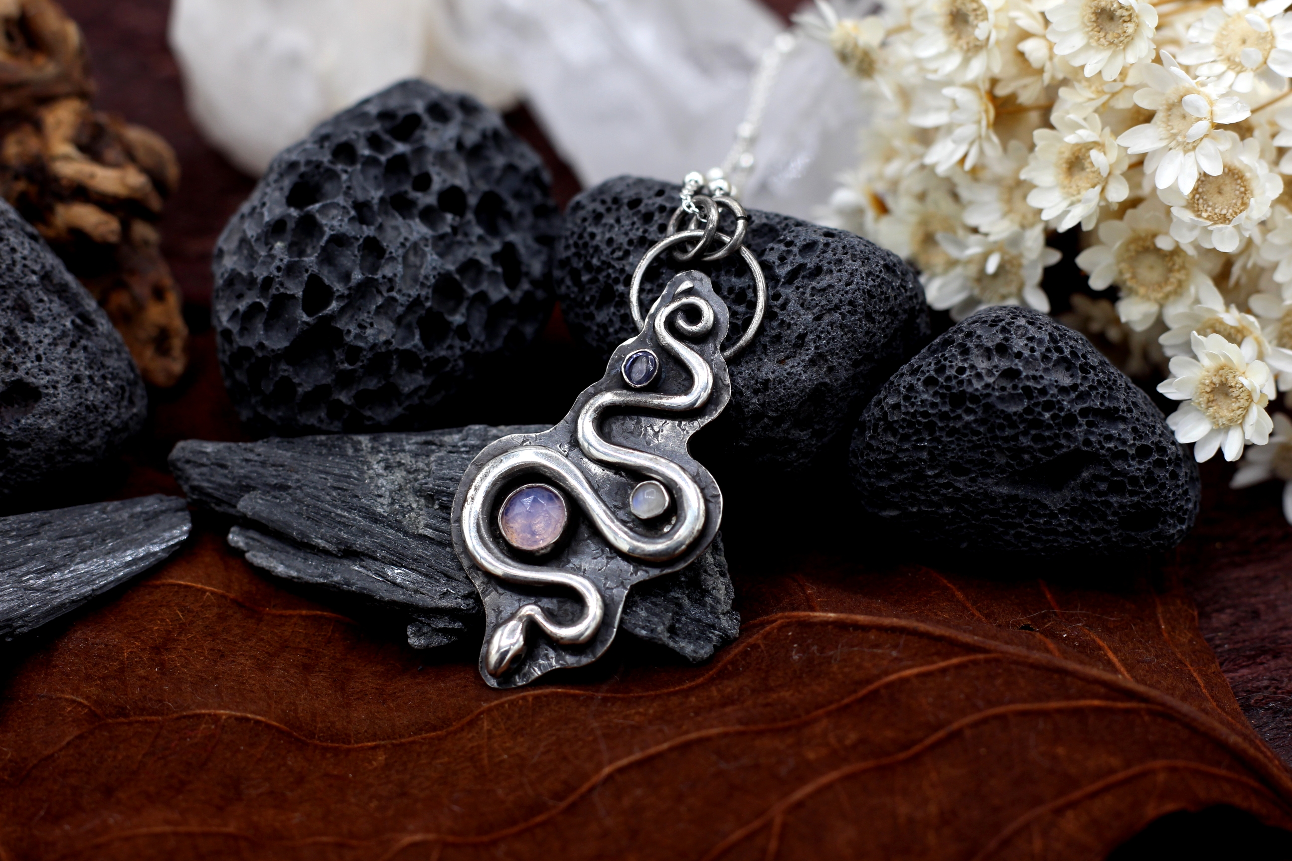 Halskette aus Sterlingsilber mit Lavendelquarz, Mondstein und Iolith