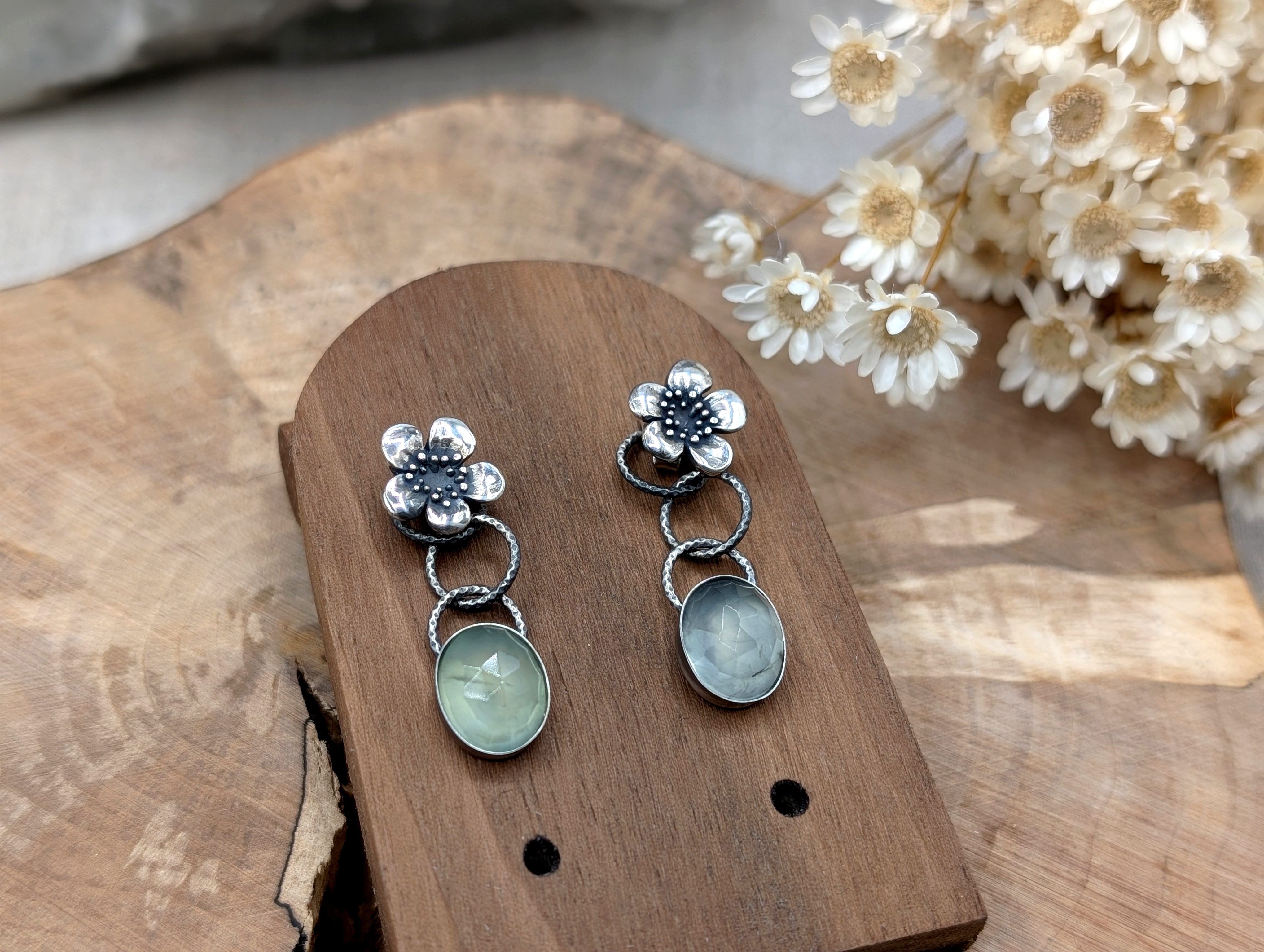 Die Ohrstecker können einzeln oder mit den Edelsteinen getragen werden. Die Länge mit Edelsteinkettchen beträgt ca. 2,5 cm.