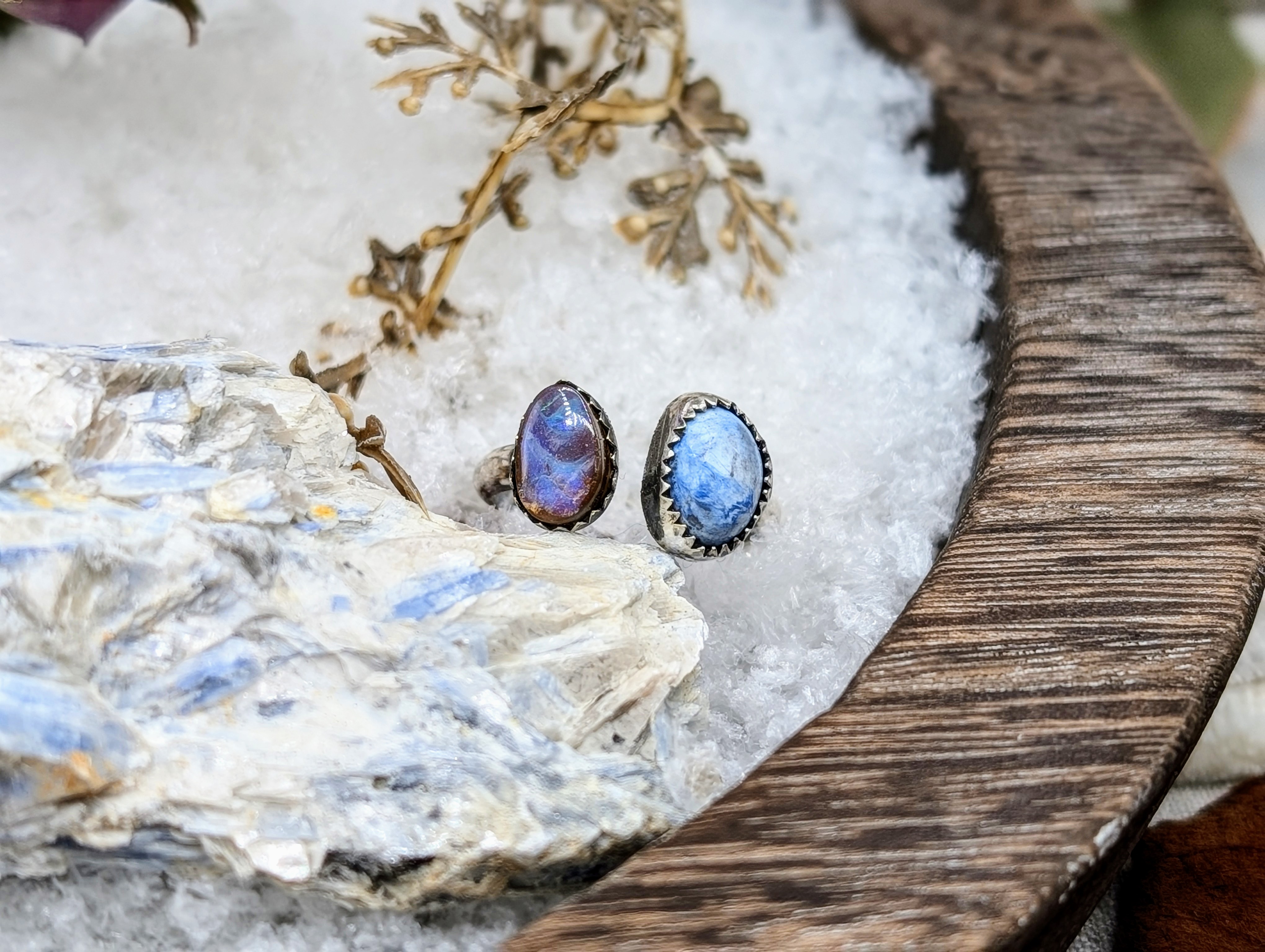 925er Sterlingsilber, australischer Opal und seltener, wertvoller Lavender Hills Türkis aus Arizona. Die Steine sind ethisch in Australien und den USA bezogen.