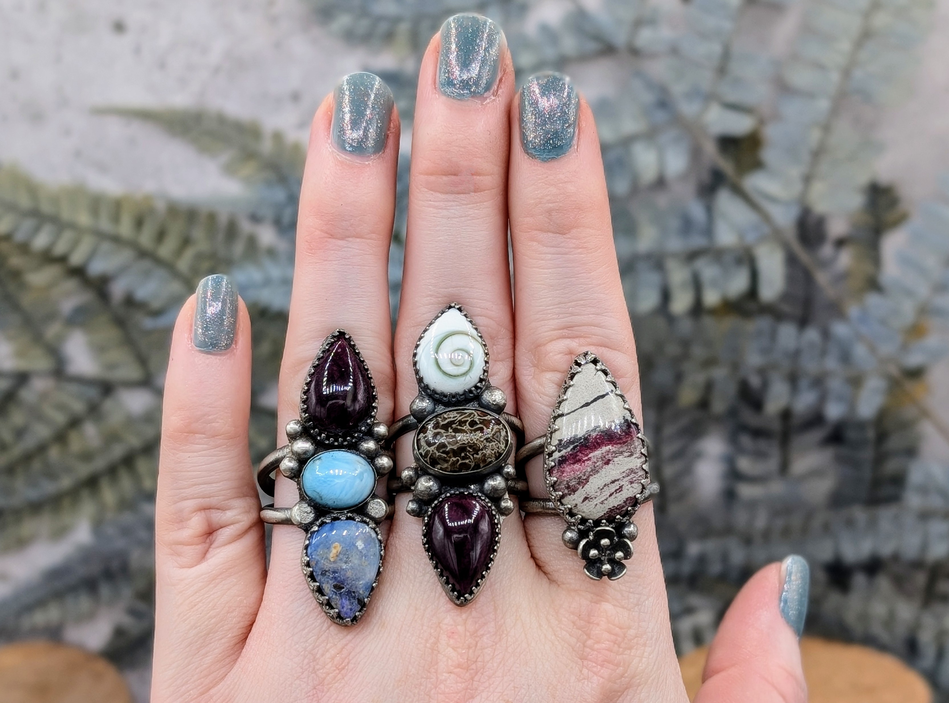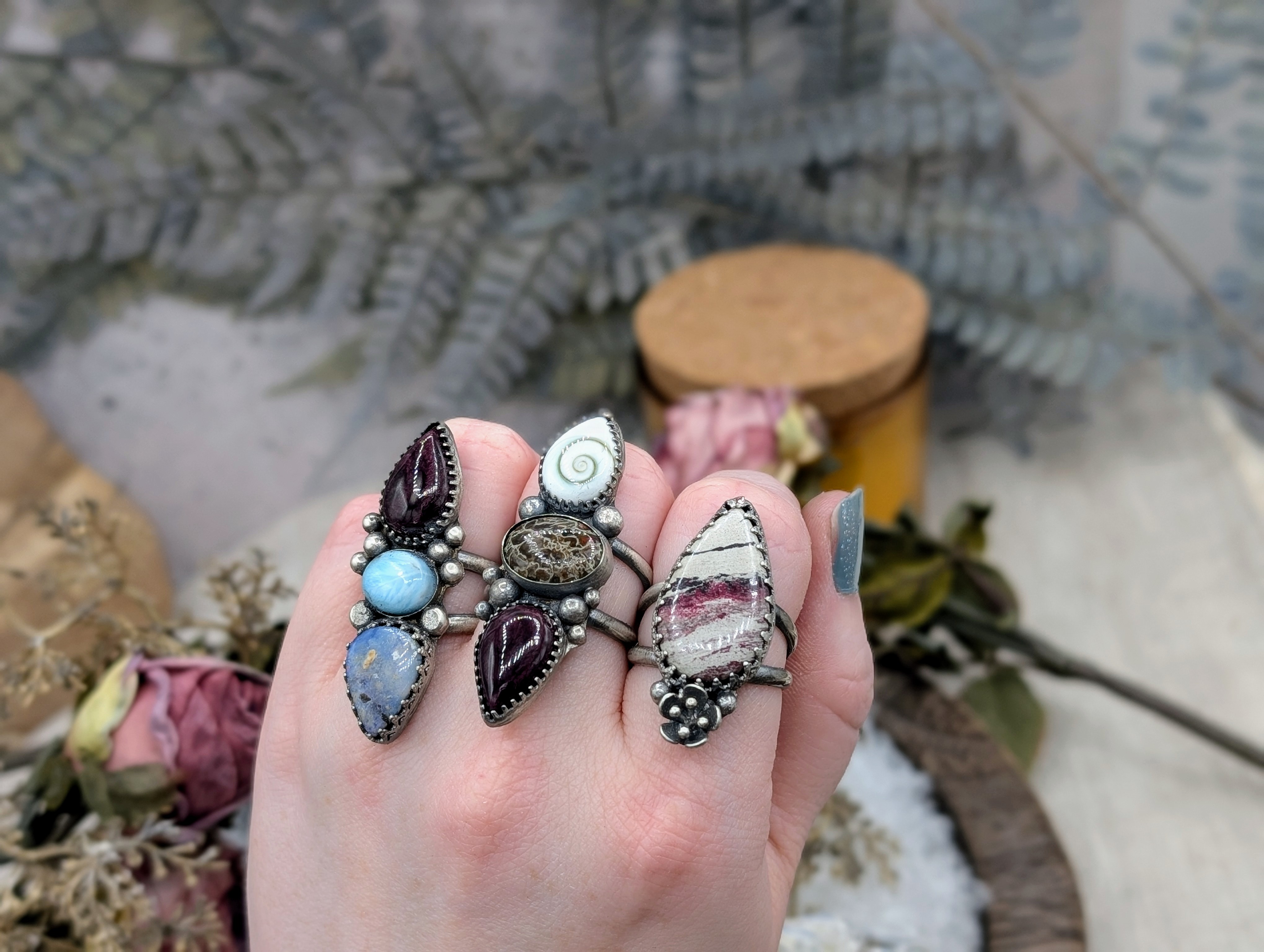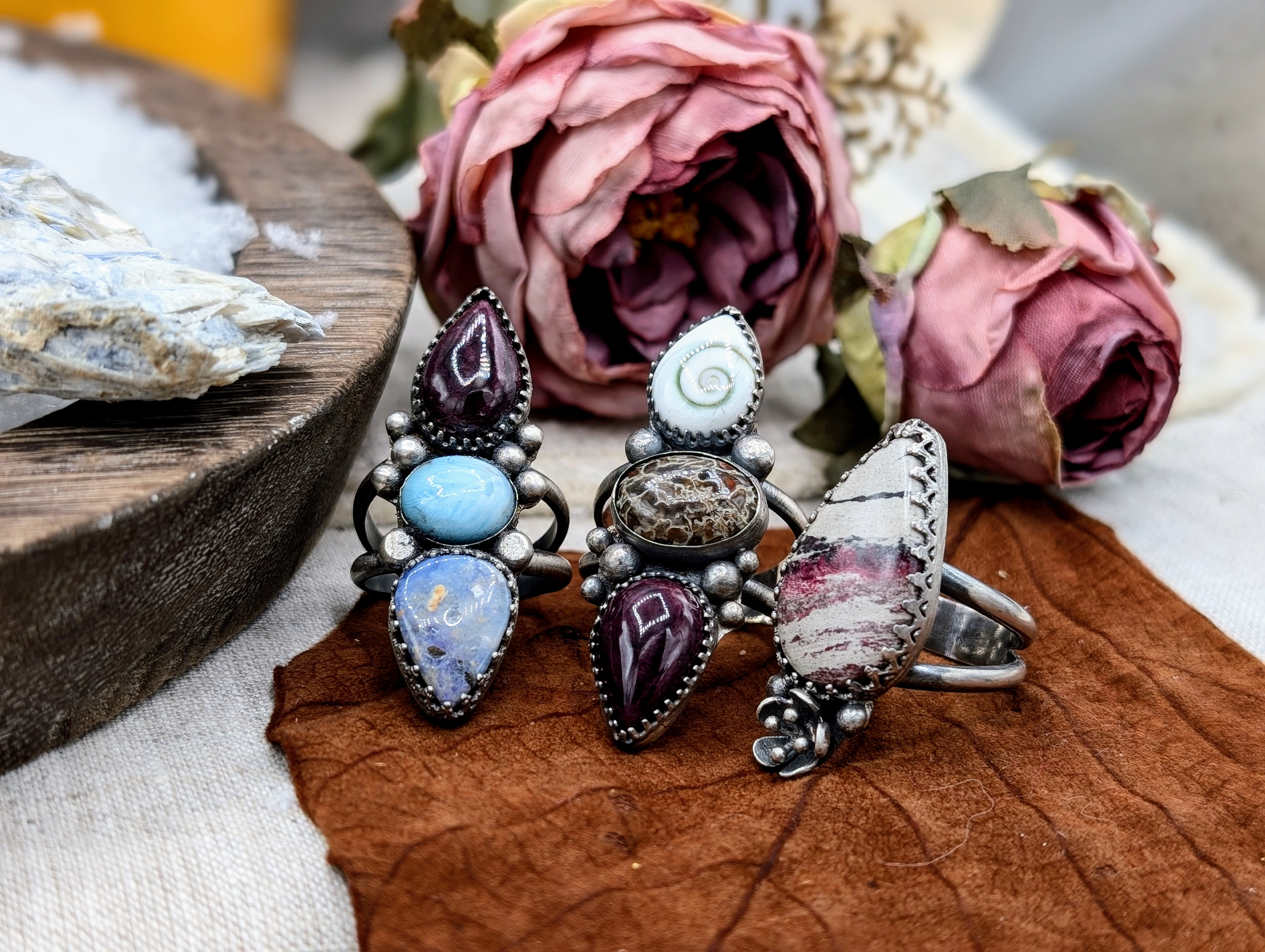 Statement Ring Gr. 56 mit Shiva Muschel, Dino Bone und Spiney Oyster Shell