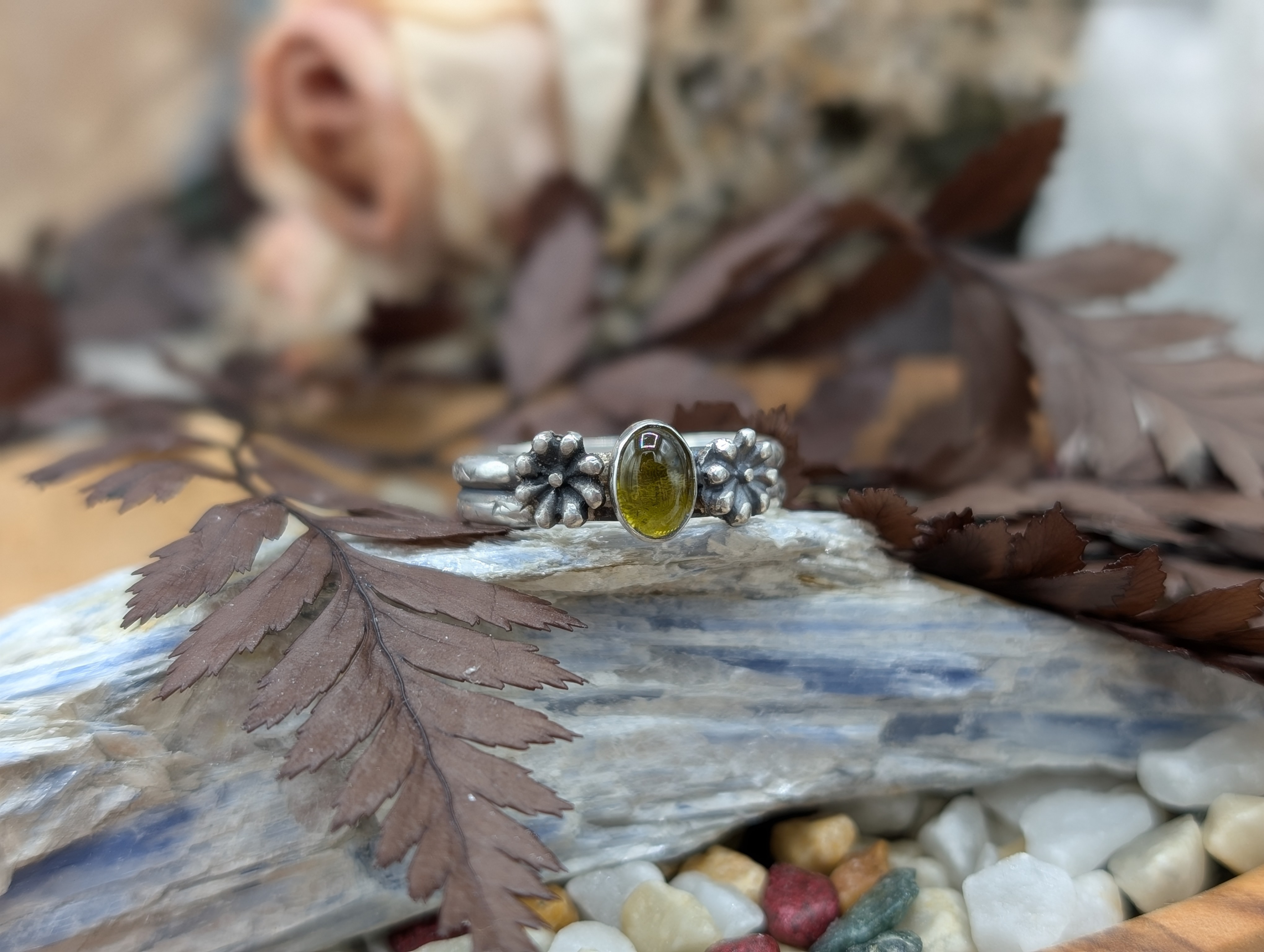 Auf dem Doppelband sind mini Sterne gestempelt und die Blumen sind von mir von Hand gefertigt. Der Peridot ist ethischer Herkunft und in den USA bezogen.