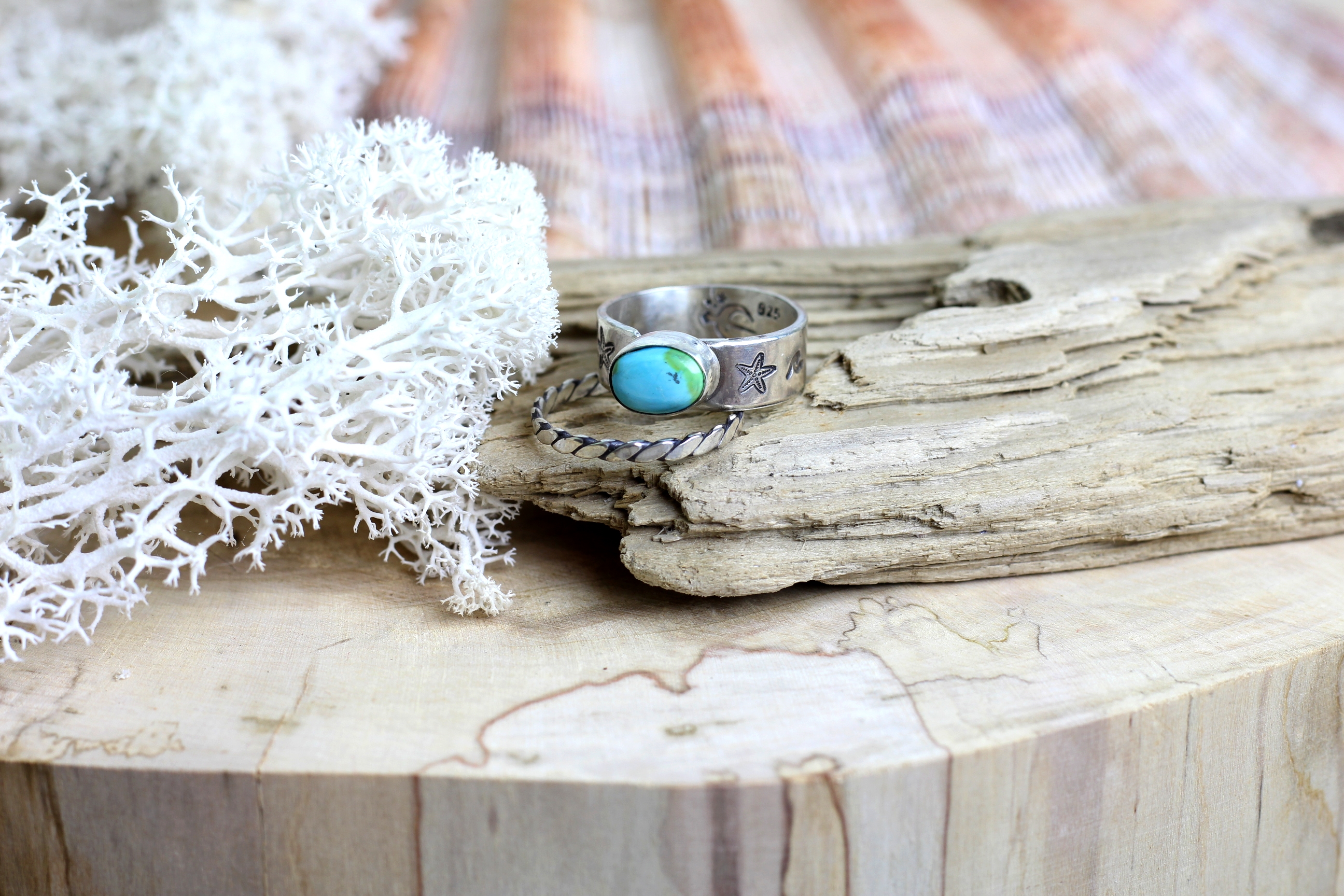 Es sind immer zwei Ringe, der breite mit Türkis und dazu ein schmale mit Welle.