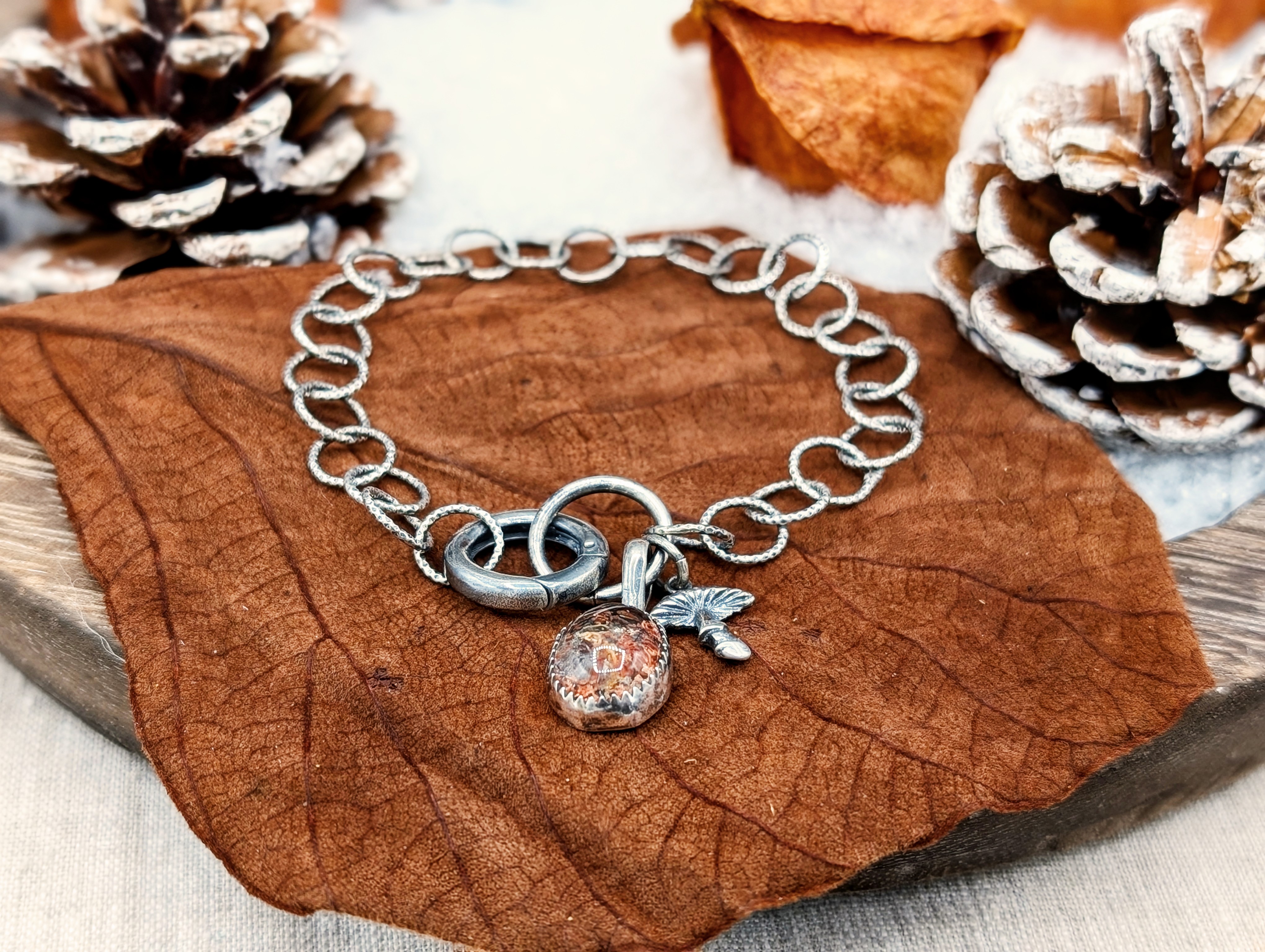 Das handgemachte Armband mit einem runden Karabiner ist 18 cm lang, lässt sich aber auch kleiner einstellen.
