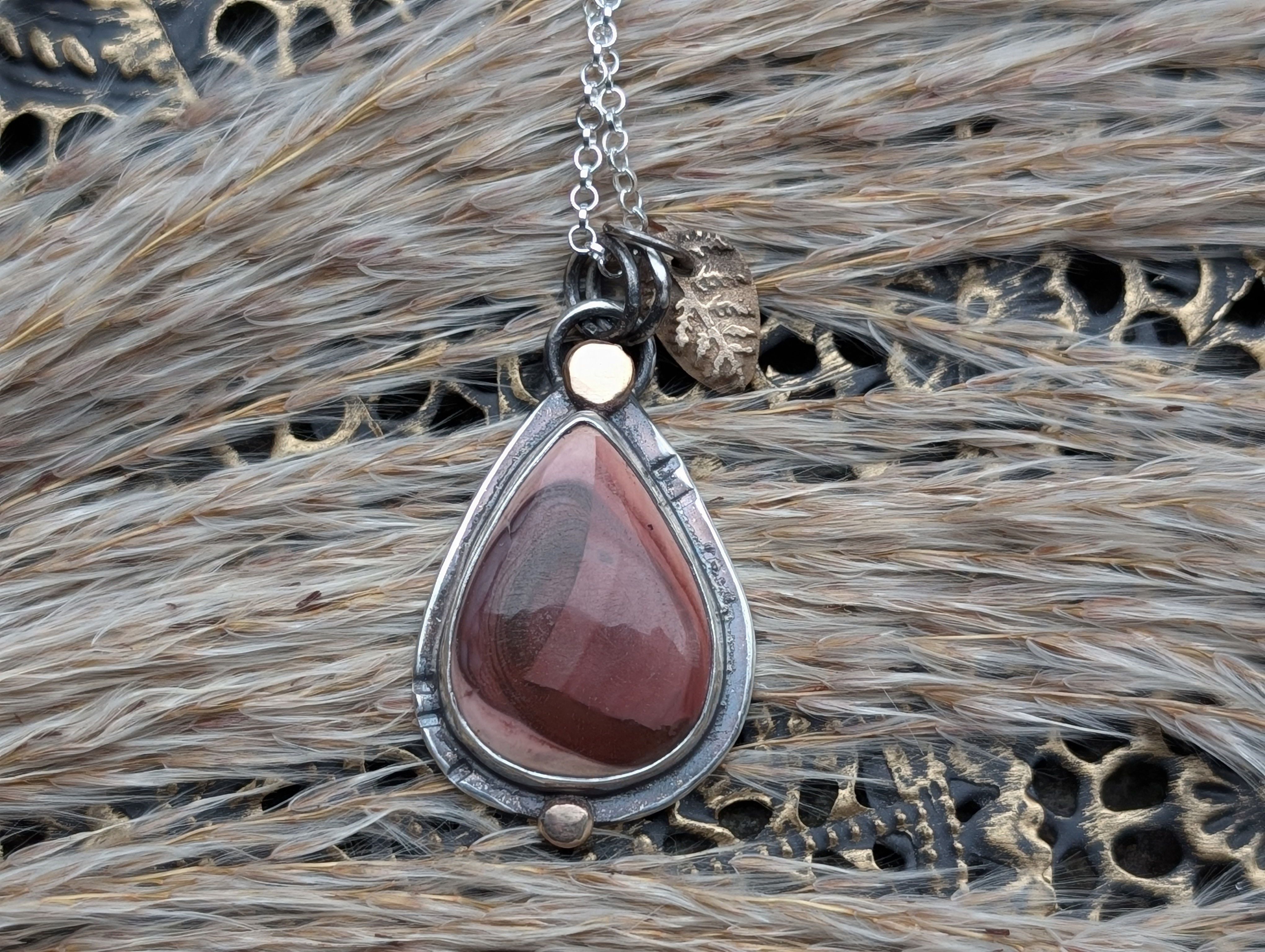 925er Sterlingsilber, Bronze, einzigartiger Ozean Jaspis aus Madagaskar, wo er nur bei Ebbe gefunden werden kann. Das kleine Farnblatt ist von mir aus Bronze gegossen. Die kleinen goldenen Punkte sind ebenfalls aus Bronze.